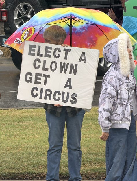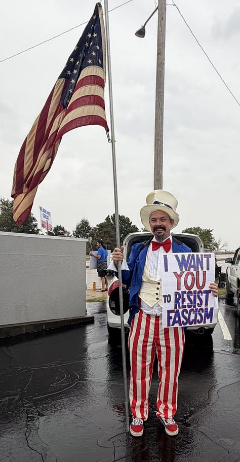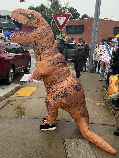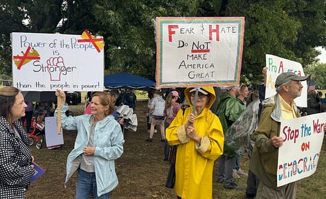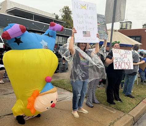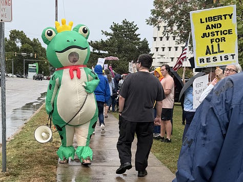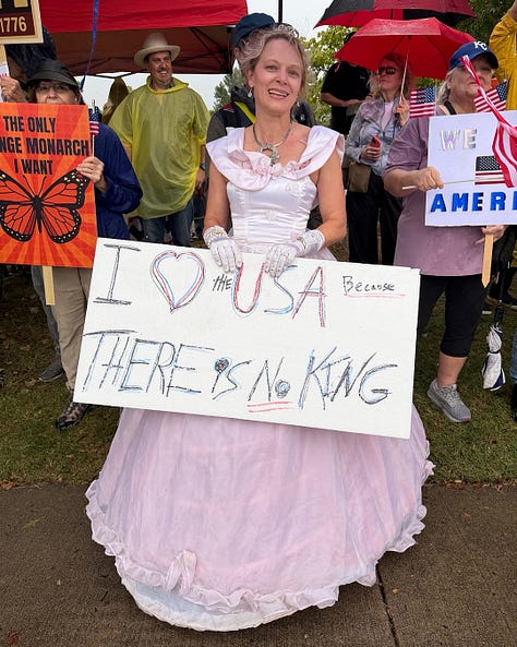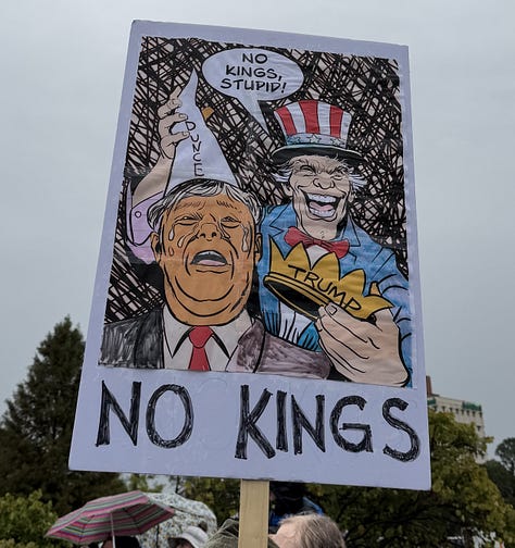 Most of the cars honked and gave a thumbs up in support. Some decorated their cars in No Kings messaging and drove around several times - a smart way to be part of the rally without being in the rally. I didn’t see any driver respond negatively to the crowd.