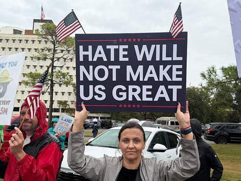They don’t like his hateful words, particularly against marginalized communities like LGBTQ+, immigrants and people of color. “Fear and hate do not make America great” was a common theme.